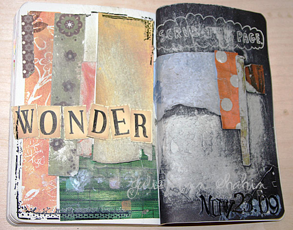 And here is a new page in my Wreck This Journal, "Scrub This Page." I pasted down some scraps from my layout above. Then I used a damp steel wool on these pages. Then I finished with the word "Wonder", some rub ons, and letter stickers. The texture from the steel wool doesn't come across that well, but I like how it looks on the scrapbook paper.
